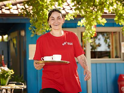 Für die ganz Kleinen gibt es den großzügig gestalteten Spielbereich. Zur Stärkung können sie in mediteraner Atmosphäre Kaffee genießen. Oder darf es zur Erfrischung ein Eis oder Kaltgetränk sein?